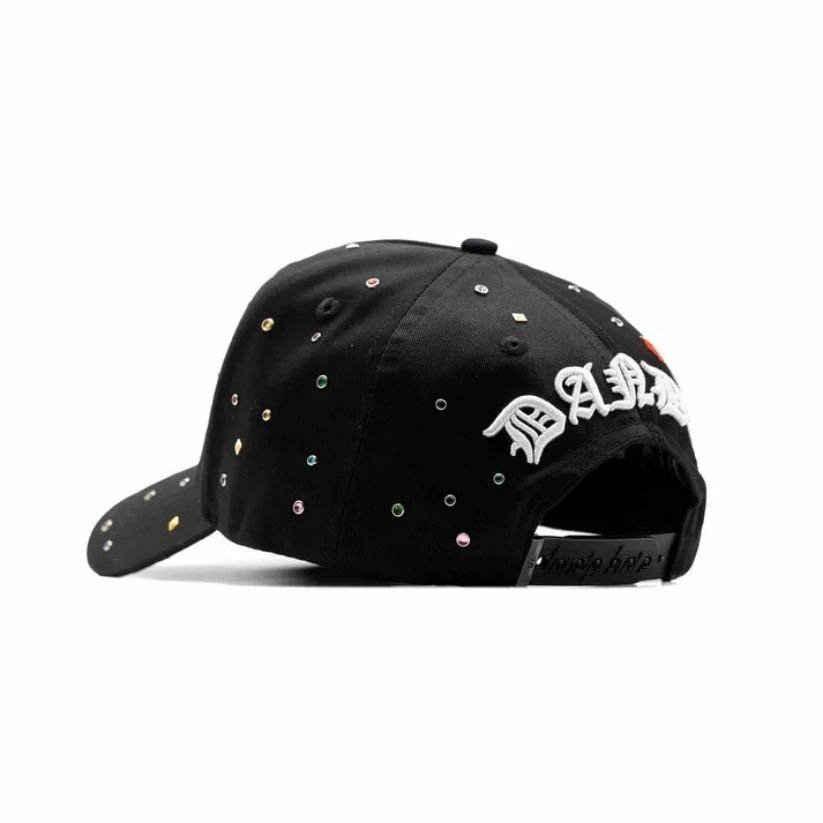 Bordado frontal multicolor “DANDY” con tipografía gótica distintiva.
