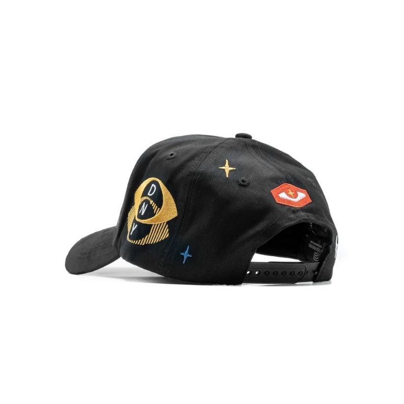 Logotipo “Dandy Studios” bordado en relieve con acabado dorado y fondo estelar.