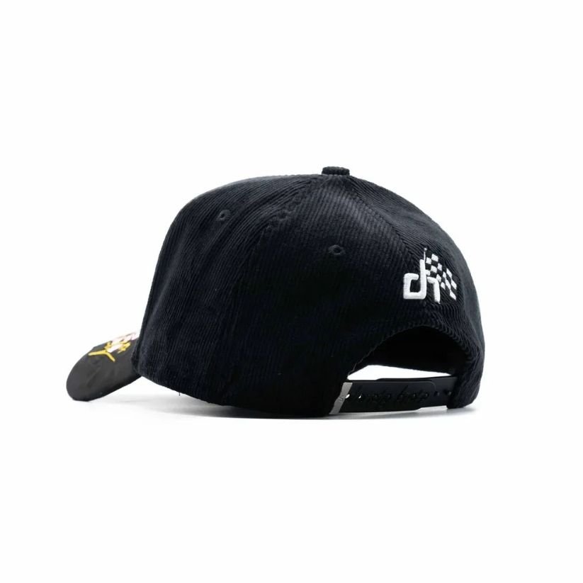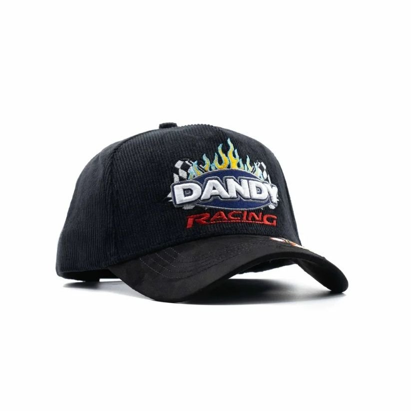 Bordado frontal con logo “Dandy Racing” y flamas en relieve tridimensional.